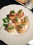 パイ生地の上にチーズとエビとアボカドののったもの